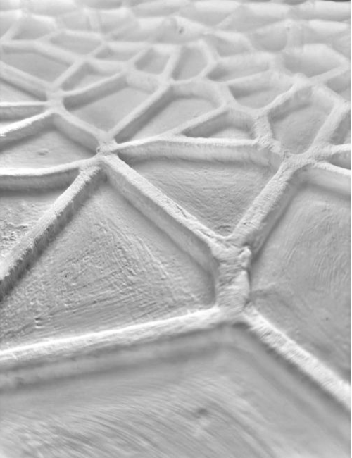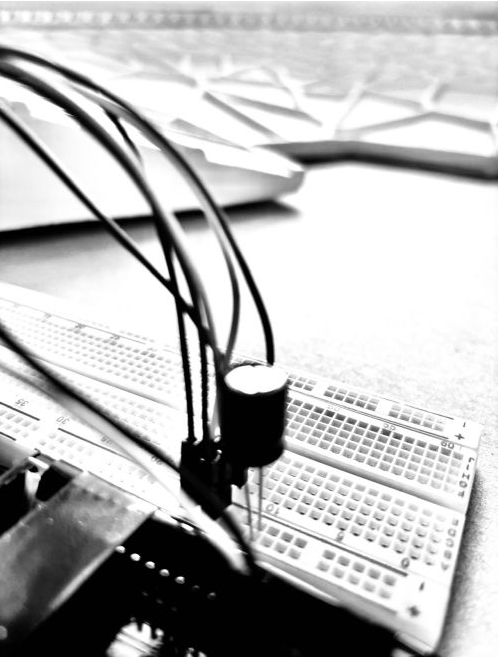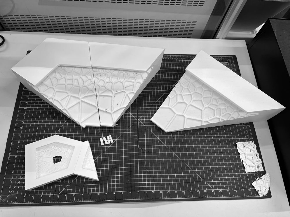 Geometry was developed in Grasshopper — the orthogonal container order preserved, the Voronoi infill used to articulate zones at room scale and acoustic / structural texture at panel scale. The lighting model was trained in Python with scikit-learn on a 70 / 30 split (~93% accuracy for illuminance, ~81% for CCT). Its predictions feed a Grasshopper visualisation and an ESP32 / Arduino prototype, driven either by a pre-computed 24-hour sequence or live from an HTML PhysioApp interface that lets the environment either mirror a detected state or compensate for it.